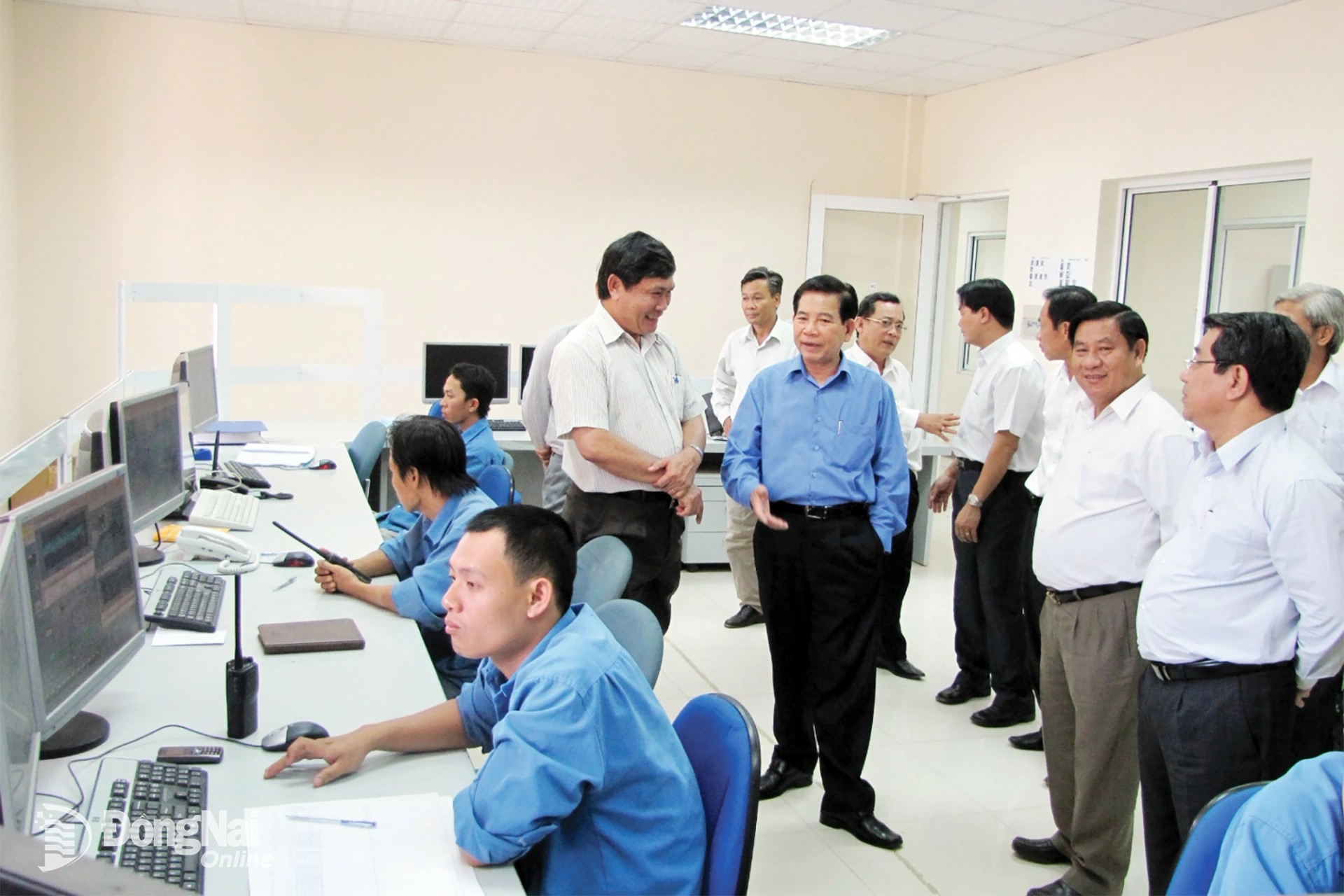 ormer State President Nguyen Minh Triet (2nd, left) and Nguyen Tan Hung (2nd, right) visit the operations center of Thac Mo Hydropower Plant in Phuoc Long ward, Dong Nai province.