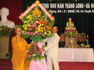 | Vice-Chairman of Dong Nai Committee of Vietnam Fatherland Front (DCVFF) Nguyen Xuan Chien offers flowers to the management board of Dong Nai Buddhist Association |