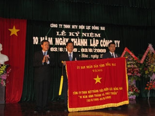 Vice chairman of the provincial People's Committee – Dinh Quoc Thai – awards the commendation flag to the company |