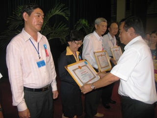| Mr.Tran Dinh Thanh, Secretary of provincial Committee of the Party, awards compliment certificates to those teams who contributes considerably to agriculture, farmers and rural issues. |