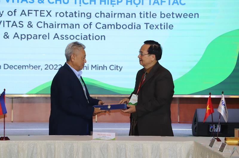 During the conference, Mr. Vu Duc Giang handed back the position of President of AFTEX to Mr. Tan Kim Teck Albert, President of the Association of Textile, Footwear, and Tourism Furniture of Cambodia.