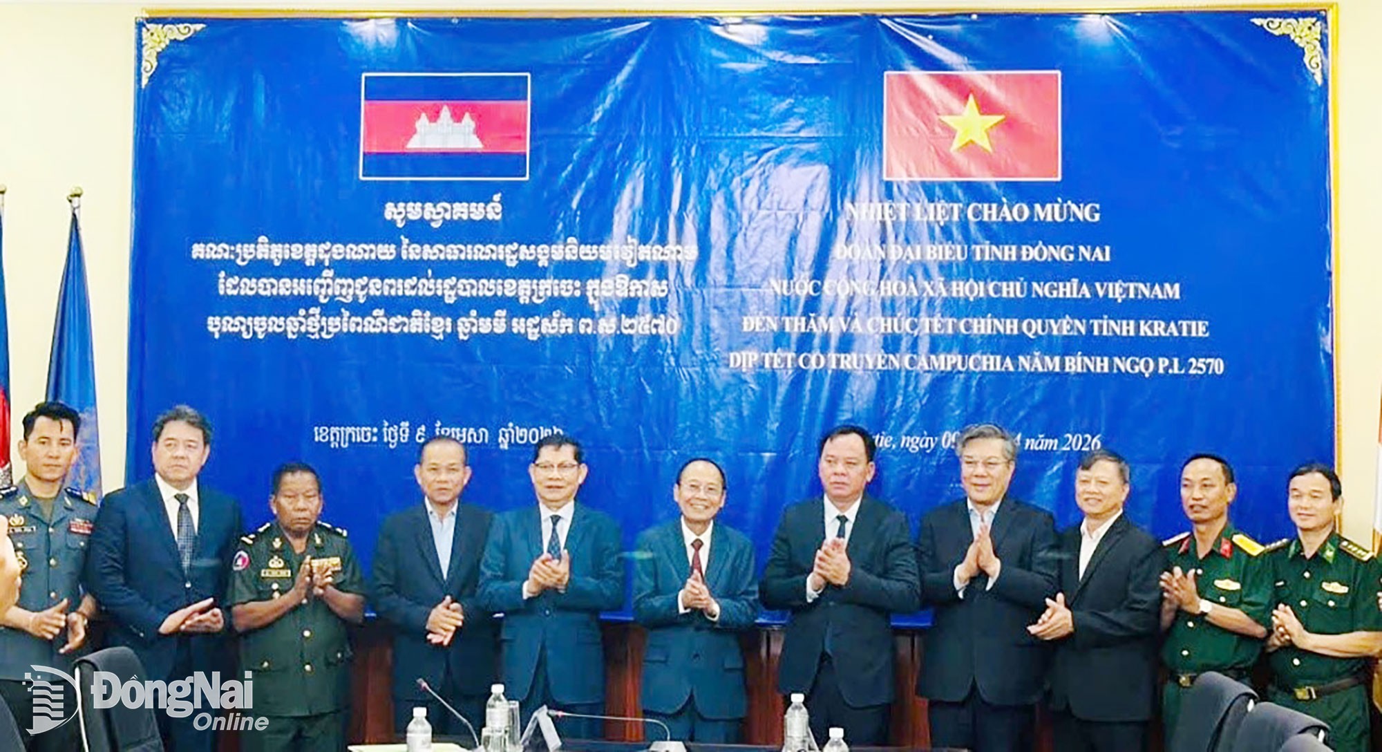 <p style="text-align: center;"><span style="color:rgb(102,102,102);">Delegates from Dong Nai pose for a commemorative photo with leaders of Kratie province, Kingdom of Cambodia. Photo: Nguyen Hang</span></p>