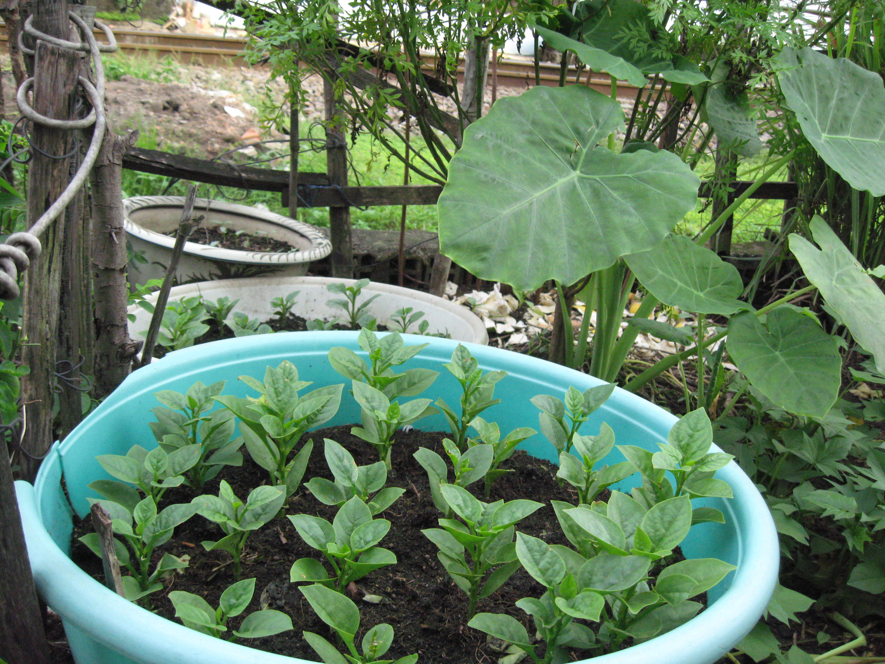 「空き地を見るのが無理ですね。私はニュースを見た時、皆はプラスチックおけ、バケツ、多孔質箱の中に野菜をを植えますので、真似てやって見ます。最初は空き陶器ポットの中に青菜類、空芯菜、つるむらさきの品種を蒔きました。それから、手間がかからないで、野菜が段々生長しています。それで、私が異なる野菜をもっと植えます。今、菜園がいっぱい野菜だね。」というワンさんが言った。