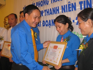 ドンナイ省の青年団書記長のブイスアントン(Bui Xuan Thong)様は代表的な団体・個人に賞状を渡している。 |