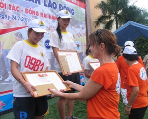 今年の大会が、Nikeベトナム企業、商売の相棒で勤めている約3千人の幹部、職員、労働者を引き付けた。距離1km(幹部向け)、距離1.2 km(全ての団体向け)、距離3km(男子青年)。2500万ドンまでの価値のある賞である。