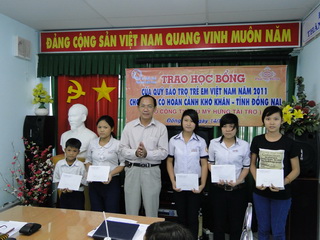 奨学金を受ける学生たちは、小学校、大学の生活が特別困難なのです。12人のうち、3年・5年・7年連続で奨学金を受けた子供もいる、残りは1年、2年。一人当たり100万ドンの奨学金が授与された。