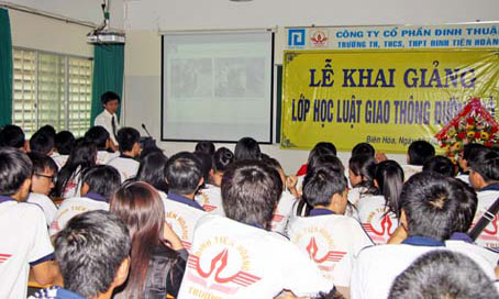 学生を案内するファム・タン・フォン先生「9月10日初めてプログラムを開始、ほとんどの学生は自覚して、先生の教えを従っています、そのようなことは交通法に対する学生の高い認識を表した」
