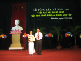 このたび、功績のある団体と個人はドンナイ省の人民委員会の賞状を受けた。また、スアンロック県にあるスアンロック高校12年生であるグエンフーズエンさんは光栄に「リトゥチョン」賞を受けた。学生11人は「キムドン」賞を受けた、7人の学生は「ドラエモン」賞を受けた。そして、ドタンコックさんとタンティミハウさんは奨学金を受けた。