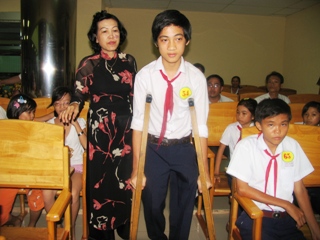トンニャット(Thong Nhat)県ザーキエム(Gia Kiem)村ドンズー(Dong Du)中学校の6年2組学生であるグエンチョンコックバオ(Nguyen Trong Quoc Bao)さんは、毎日学校へ松葉杖で行っている。 |
