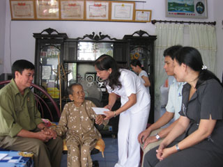 빙구현적십자사는 노인에게 방문하여 선물을 준다