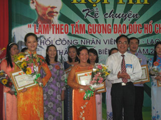 “호치민도덕적인모범대로 이행” 스토리텔링경연대회에 참가하는 학생들에게 수상을 수여