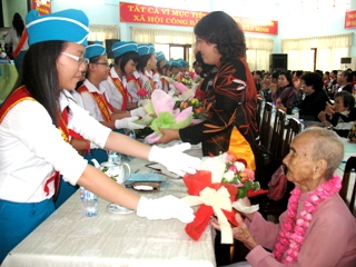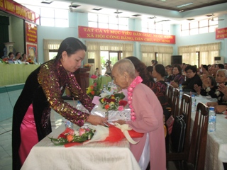 도시 여성연합회 대표자는 대회에서 참석하는 베트남 영웅 어머니에게 선물을 드림