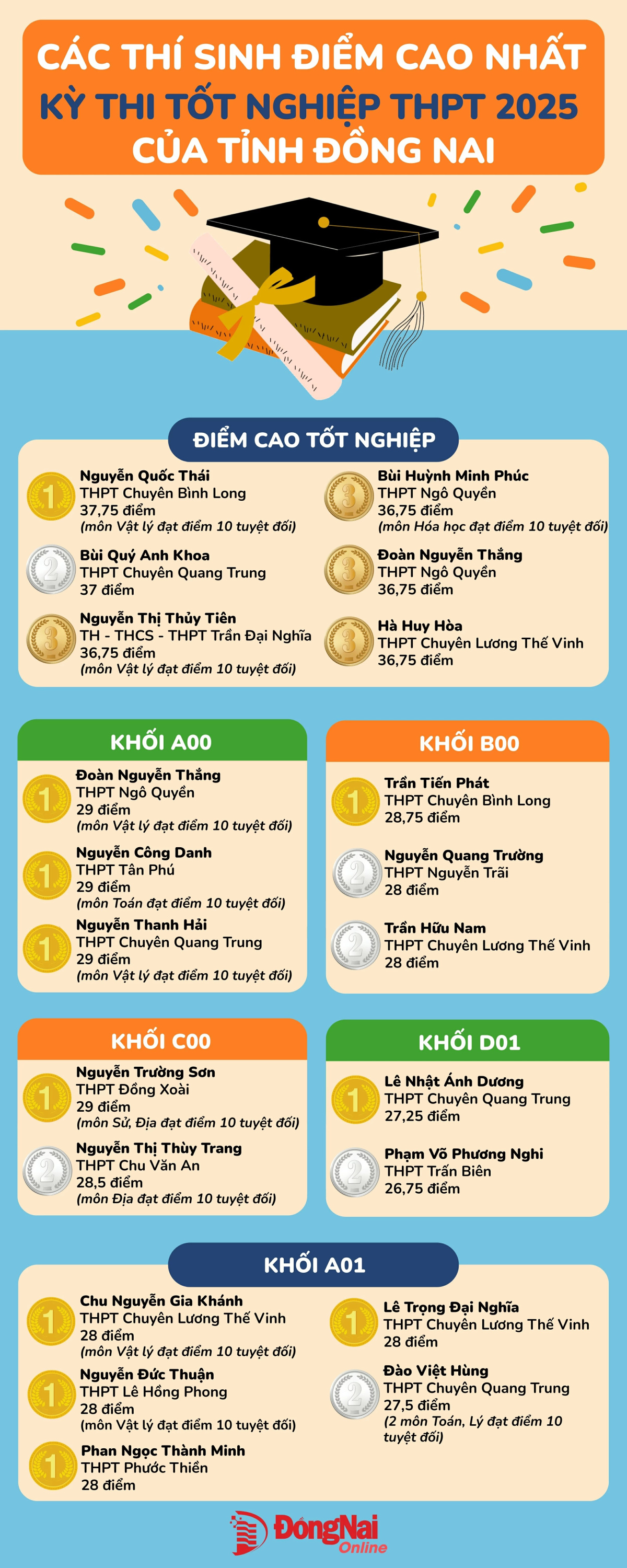 (CTT-Đồng Nai) - Kỳ thi tốt nghiệp THPT quốc gia năm 2025 để lại nhiều dấu ấn với những con số ấn tượng và những gương mặt điểm cao xuất sắc ở từng khối thi. Mỗi người một con đường, một ước mơ, nhưng điểm chung là cùng chạm tay tới đỉnh cao của tri thức với những số điểm đáng tự hào.