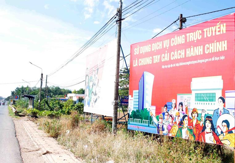 Một tấm áp phích tuyên truyền về sử dụng dịch vụ công trực tuyến trên địa bàn huyện Trảng Bom