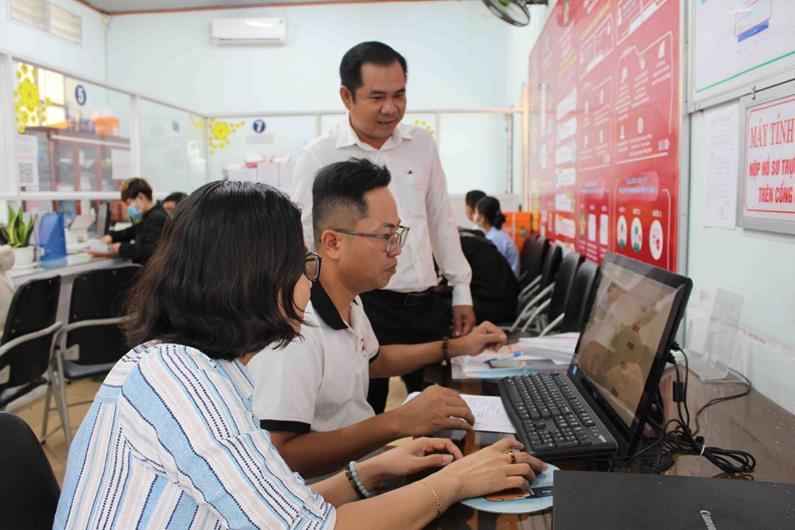 Cán bộ Bộ phận một cửa xã Tam An, huyện Long Thành đang hướng dẫn người dân sử dụng dịch vụ công trực tuyến