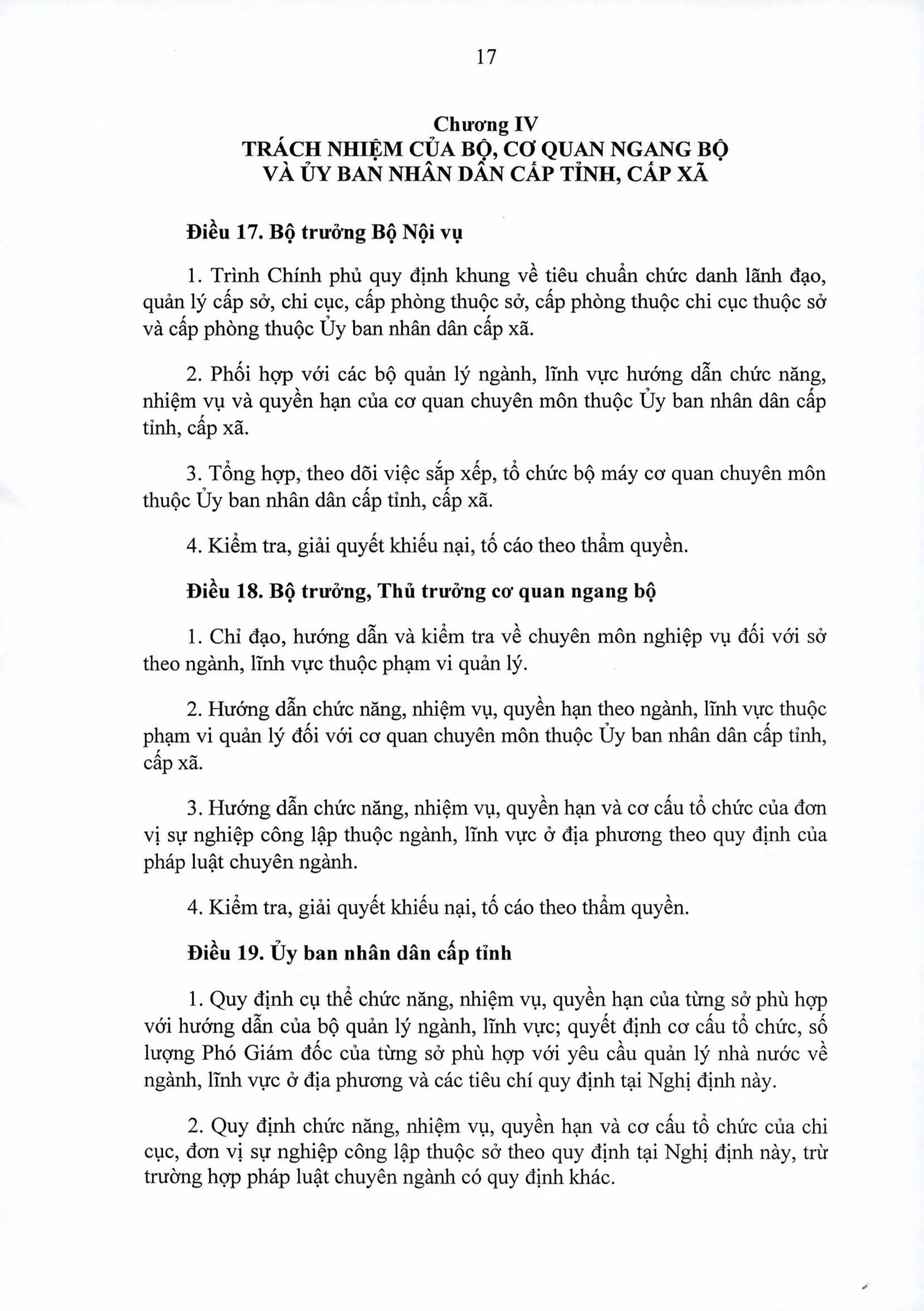 Chương IV - Trách nhiệm của Bộ, cơ quan ngang bộ và Ủy ban nhân dân cấp tỉnh, cấp xã (từ điều 17 đến điều 22).