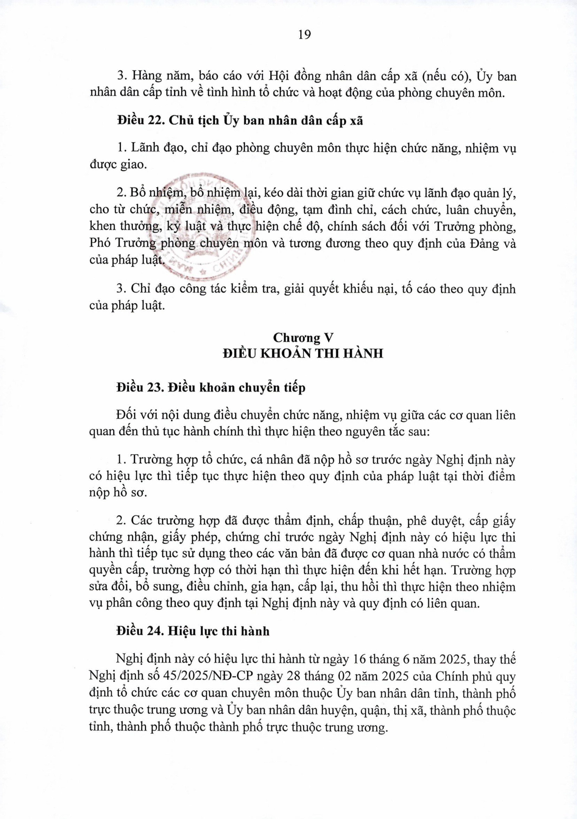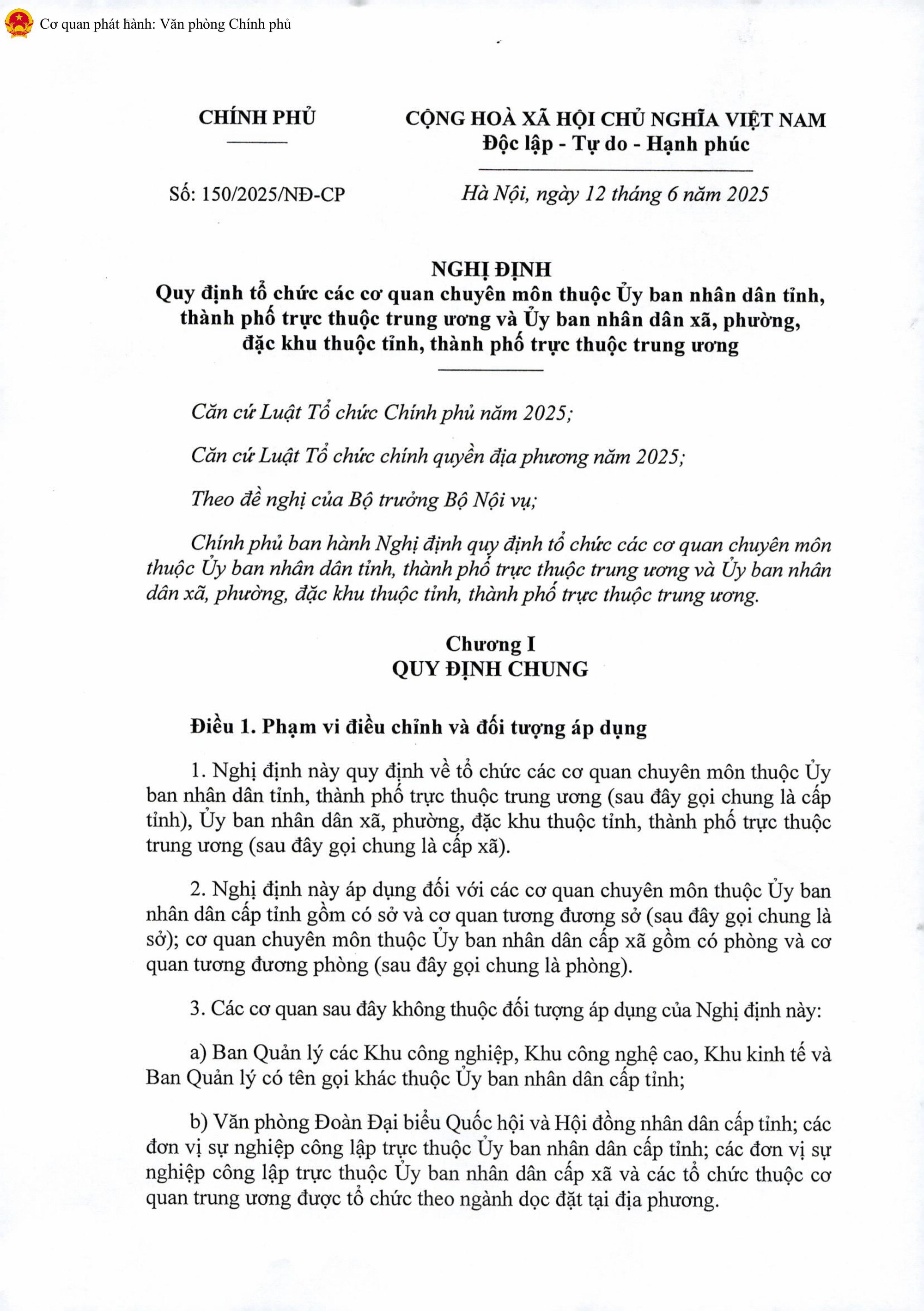 Nghị định số 150/2025/NĐ-CP của Chính phủ quy định tổ chức các cơ quan chuyên môn thuộc Ủy ban nhân dân tỉnh, thành phố trực thuộc trung ương và Ủy ban nhân dân xã, phường, đặc khu thuộc tỉnh, thành phố trực thuộc trung ương có 5 chương, 25 điều.