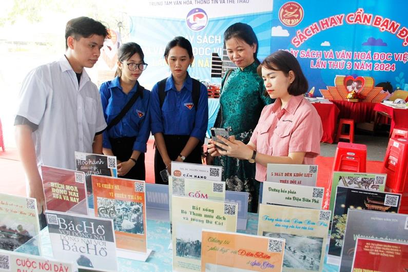 Cán bộ Thư viện Đồng Nai hướng dẫn bạn đọc quét mã QR sách và tài liệu địa chí nhân Ngày sách và văn hóa đọc Việt Nam 2024
