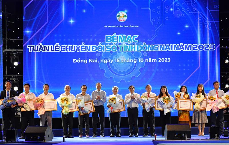 Lãnh đạo tặng Bằng khen của UBND tỉnh cho các đơn vị đã có đóng góp tích cực trong việc tổ chức Tuần lễ Chuyển đổi số Đồng Nai năm 2023.
