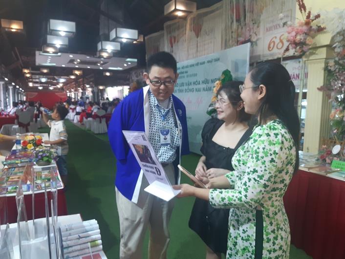 Cán bộ Thư viện Đồng Nai giới thiệu mã QR sách về văn hóa Đồng Nai cho du khách đến từ Nhật Bản