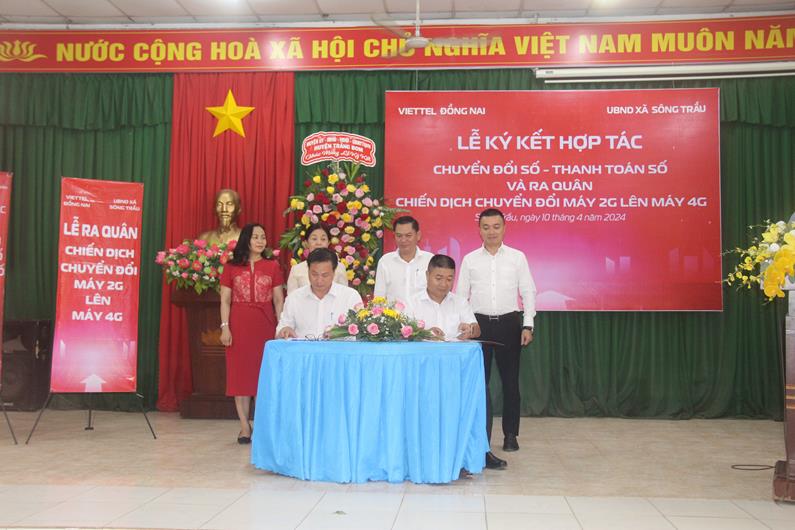 Giám đốc Viettel Đồng Nai Ngô Mạnh Hùng cam kết sẽ tham mưu, tổ chức thực hiện các nội dung chuyên môn về xây dựng điểm xã chuyển đổi số... Đặc biệt là chuyển đổi toàn bộ thuê bao di động 2G cho bà con trên địa bàn từ nay đến hết tháng 9-2024.