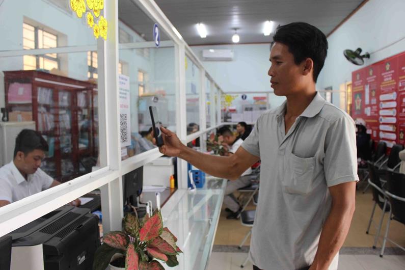 Người dân xã Tam An đang quét mã QR để đánh giá chất lượng phục vụ hành chính của cán bộ, công chức