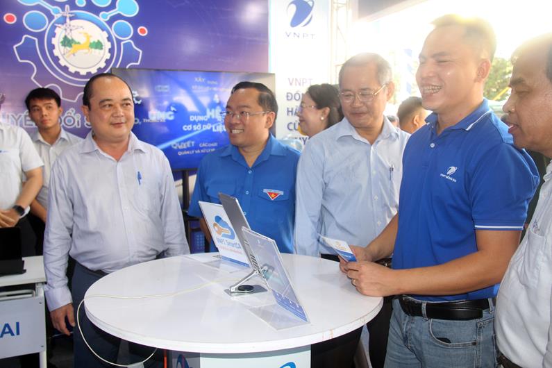Lãnh đạo Sở Thông tin và Truyền thông, Tỉnh đoàn, UBND huyện Định Quán tham quan các gian trưng bày các sản phẩm công nghệ số tại không gian triển lãm về chuyển đổi số tại chương trình.