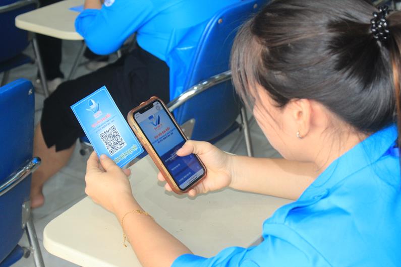 Đại biểu tham dự Đại hội Hội Liên hiệp Thanh niên cơ sở dùng điện thoại quét mã QR-Code để theo dõi nội dung đại hội