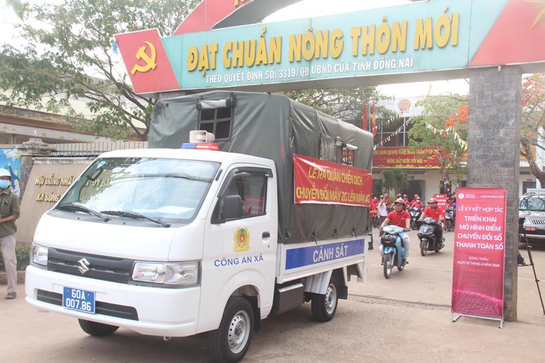 Đoàn xe diễu hành ra quân tuyên truyền, hỗ trợ chuyển đổi thuê bao 2G sang 4G tại xã Sông Trầu (huyện Trảng Bom).