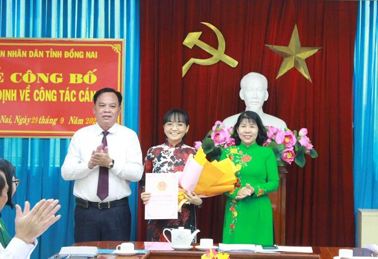 Quyền Chủ tịch UBND tỉnh Võ Tấn Đức và Phó Chủ tịch HĐND tỉnh Hoàng Thị Bích Hằng trao quyết định và tặng hoa cho bà Trương Thị Mỹ Dung