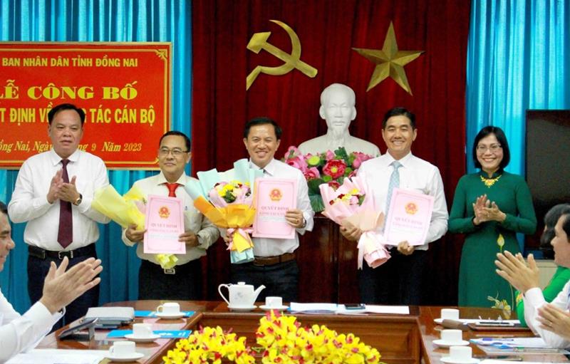 Quyền Chủ tịch UBND tỉnh Võ Tấn Đức và Phó Chủ tịch UBND tỉnh Nguyễn Thị Hoàng trao quyết định và hoa cho các đồng chí được bổ nhiệm mới và bổ nhiệm lại