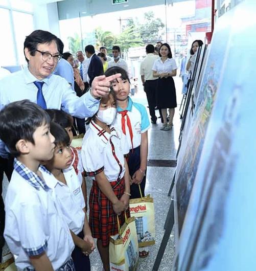 Phó Chủ tịch UBND tỉnh Nguyễn Sơn Hùng cùng học sinh nhận học bổng Vượt khó vì tương lai cùng xem triển lãm ảnh Trường Sa - Nhà giàn thân yêu tại Báo Đồng Nai