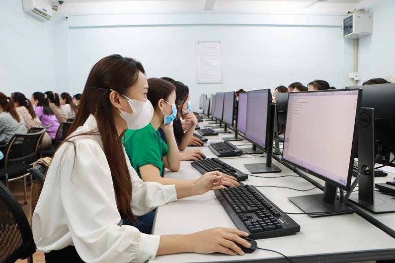 Các giáo viên dự thi vòng 1 làm bài trên máy tính