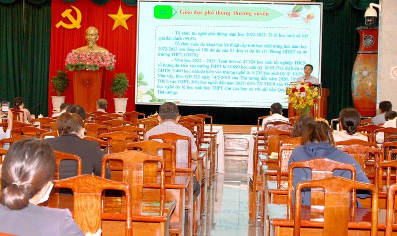 Phó Giám đốc Sở GD-ĐT Đỗ Huy Khánh báo cáo chuyên đề liên quan đến những kết quả nổi bật trong công tác giáo dục và đào tạo năm học 2022-2023 trên địa bàn tỉnh tại hội nghị báo cáo viên thường kỳ tháng 7