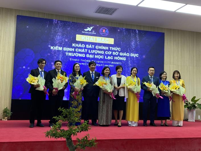 Lãnh đạo Trường Đại học Lạc Hồng tặng hoa cho thành viên đoàn đánh giá ngoài (Trung tâm Kiểm định chất lượng Đại học Quốc gia TP.HCM)