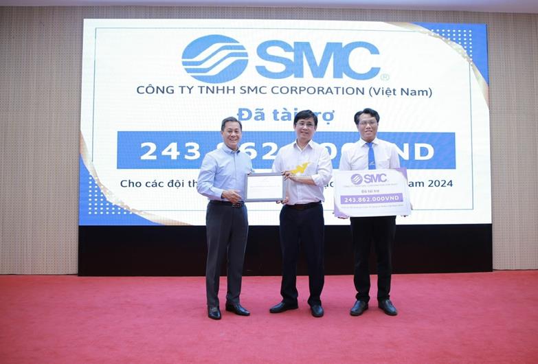 Đại diện doanh nghiệp đến chúc mừng và trao tài trợ cho các đội tuyển của Trường Đại học Lạc Hồng tham gia cuộc thi robocon năm 2024.
