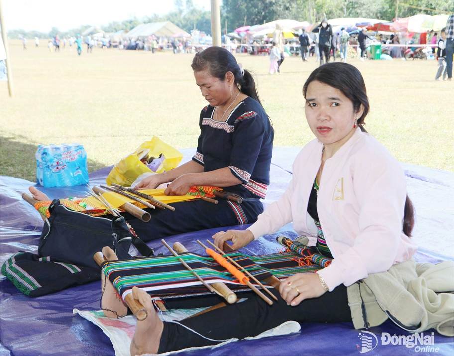 Người dân xã Thọ Sơn tái hiện dệt thổ cẩm tại Ngày hội Đại đoàn kết toàn dân tộc. Ảnh: Văn Truyên