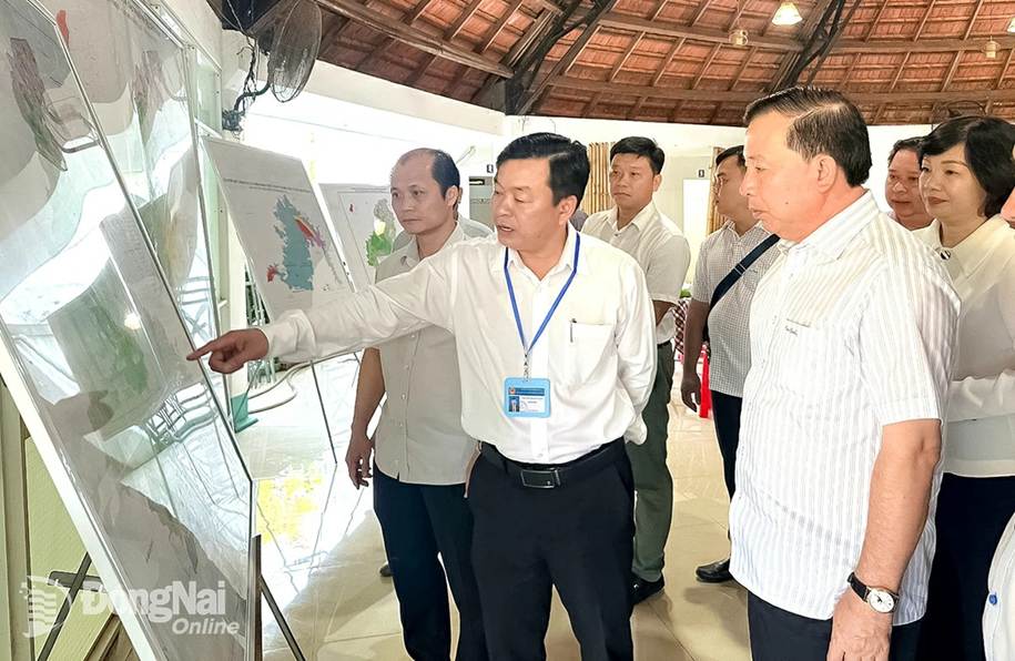 Đồng chí Nguyễn Văn Út, Phó Bí thư Tỉnh ủy, Chủ tịch UBND tỉnh Đồng Nai tham khảo bản đồ quy hoạch Khu Bảo tồn Thiên nhiên - Văn hóa Đồng Nai. Ảnh: Ngọc Liên