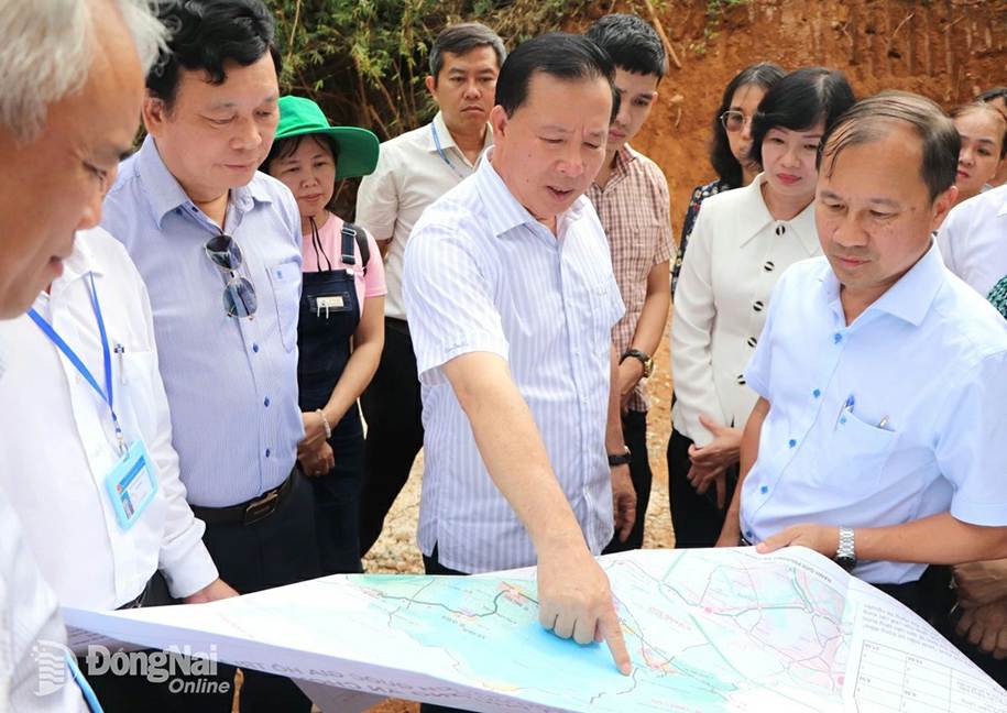 Đồng chí Nguyễn Văn Út, Phó Bí thư Tỉnh ủy, Chủ tịch UBND tỉnh Đồng Nai nghe báo cáo về dự án cầu Mã Đà. Ảnh: Ngọc Liên