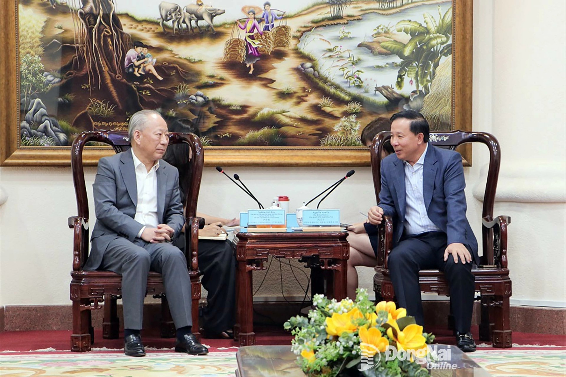 Đồng chí Nguyễn Văn Út, Phó Bí thư Tỉnh ủy, Chủ tịch UBND tỉnh Đồng Nai trao đổi với ông Nghiêm Giới Hòa, người sáng lập Tập đoàn Xây dựng Thái Bình Dương, Tập đoàn Xây dựng Đại Tây Dương, Chủ tịch Viện nghiên cứu Trang Nghiêm. Ảnh: Phạm Tùng
