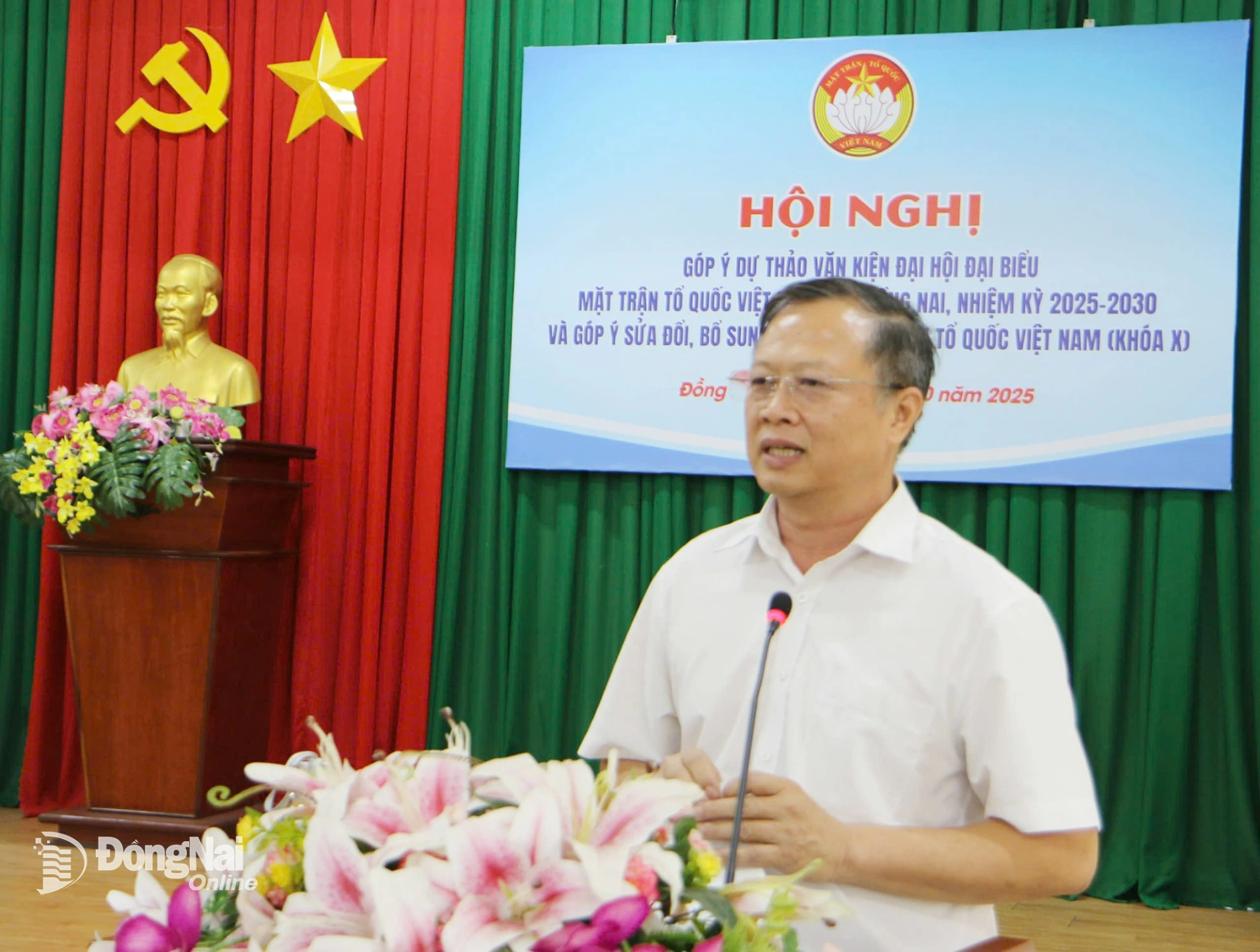 | Phó Chủ tịch Ủy ban MTTQ Việt Nam tỉnh Đồng Nai Nguyễn Tấn Phú giới thiệu dự thảo văn kiện. Ảnh: Văn Truyên |