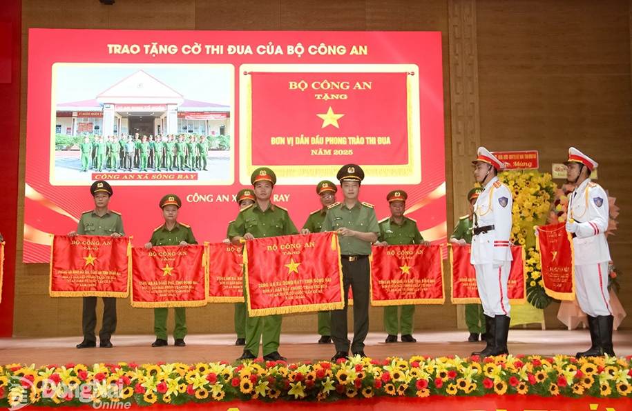 Trung tướng Đặng Hồng Đức, Thứ trưởng Bộ Công an trao cờ thi đua của Bộ Công an cho các đơn vị đạt thành tích. Ảnh: Trần Danh