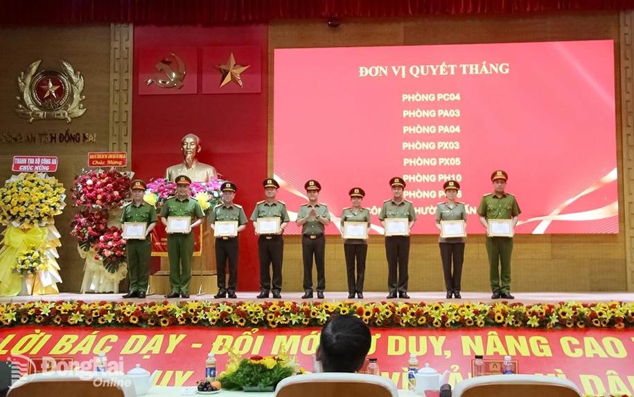 Thiếu tướng Nguyễn Đức Hải, Ủy viên Ban Thường vụ Tỉnh ủy, Giám đốc Công an tỉnh Đồng Nai trao khen thưởng cho các đơn vị quyết thắng. Ảnh: Trần Danh