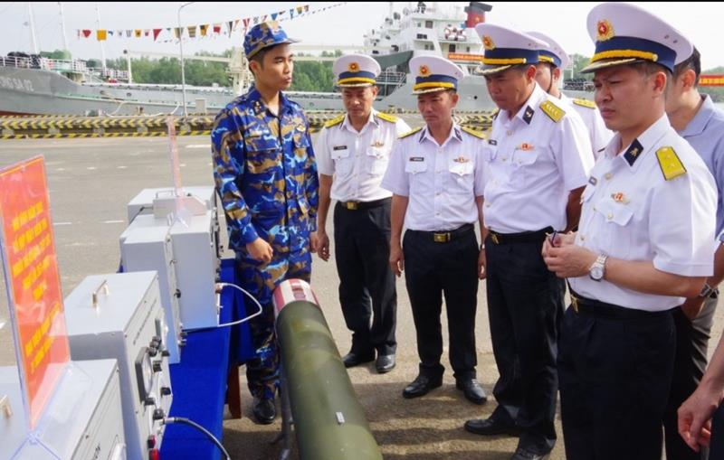 Cán bộ chiến sĩ Trung tâm Bảo đảm kỹ thuật Vùng 2 Hải quân giới thiệu các mô hình, sáng kiến học Bác từ thi đua quyết thắng.