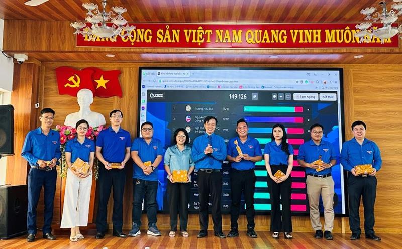 Bí thư Đoàn Khối các cơ quan tỉnh Vy Hoài Vũ tặng thưởng cho các cá nhân đạt thành tích cao trong mini game tìm hiểu về tư tưởng, đạo đức, phong cách Hồ Chí Minh