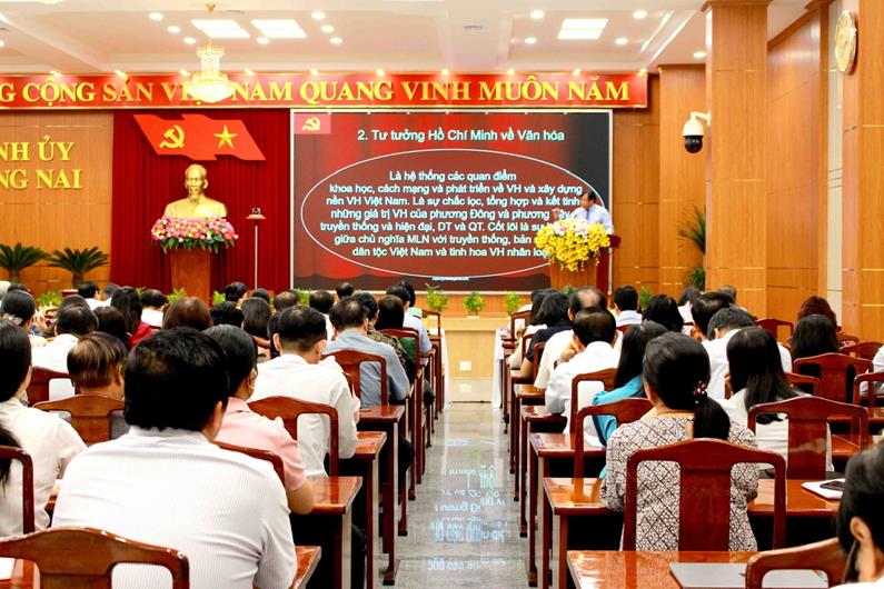 Theo PGS, TS. Nguyễn Quốc Dũng, Đảng ta xác định, văn hóa là nền tảng tinh thần của xã hội, là mục tiêu, động lực phát triển bền vững đất nước. Văn hóa phải được đặt ngang hàng với kinh tế, chính trị, xã hội. Theo đó cần xây dựng văn hóa trong chính trị, kinh tế, đặc biệt là văn hóa trong Đảng trở thành tấm gương đạo đức cho xã hội. PGS, TS đã tập trung phân tích sâu những nội dung cơ bản về tư tưởng, đạo đức, phong cách Hồ Chí Minh, quan điểm của Đảng về xây dựng văn hóa, con người, gắn với thực hiện Nghị quyết số 12-NQ/TU ban hành ngày 12-12-2023 của Ban Chấp hành Đảng bộ tỉnh về về xây dựng và phát huy giá trị văn hóa con người Đồng Nai trở thành nguồn lực, động lực quan trọng cho sự phát triển toàn diện và bền vững.
