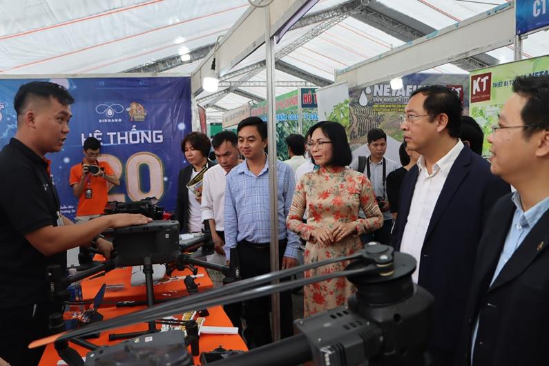 Phó chủ tịch UBND tỉnh Nguyễn Thị Hoàng cùng lãnh đạo Bộ Khoa học – Công nghệ tham quan các gian hàng tại Tech mart Đồng Nai 2023.