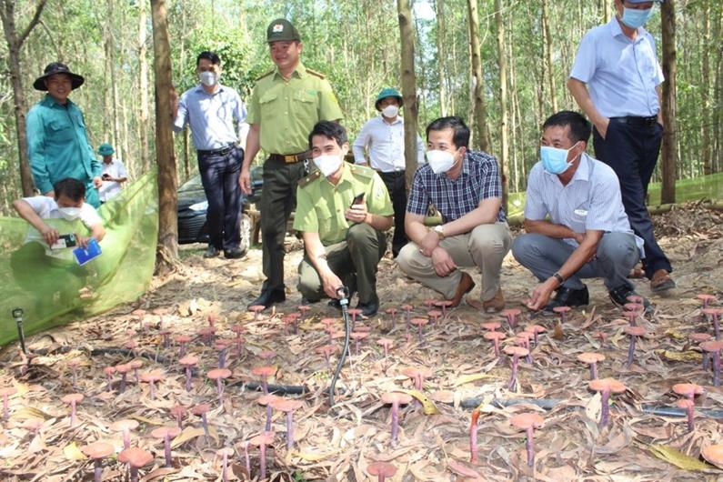 Lãnh đạo Sở KH-CN và các đơn vị liên quan thẩm định kết quả trồng nấm linh chi dưới tán rừng keo lai
