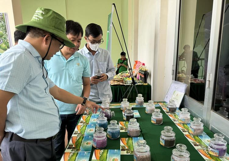 Khách tham quan gian hàng trưng bày vật tư nông nghiệp bên lề hội nghị.