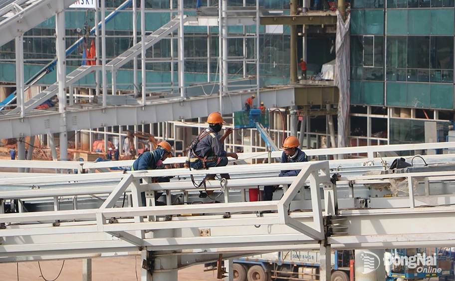 Công nhân thi công cầu ống lồng nhà ga hành khách Sân bay Long Thành. Ảnh: Phạm Tùng
